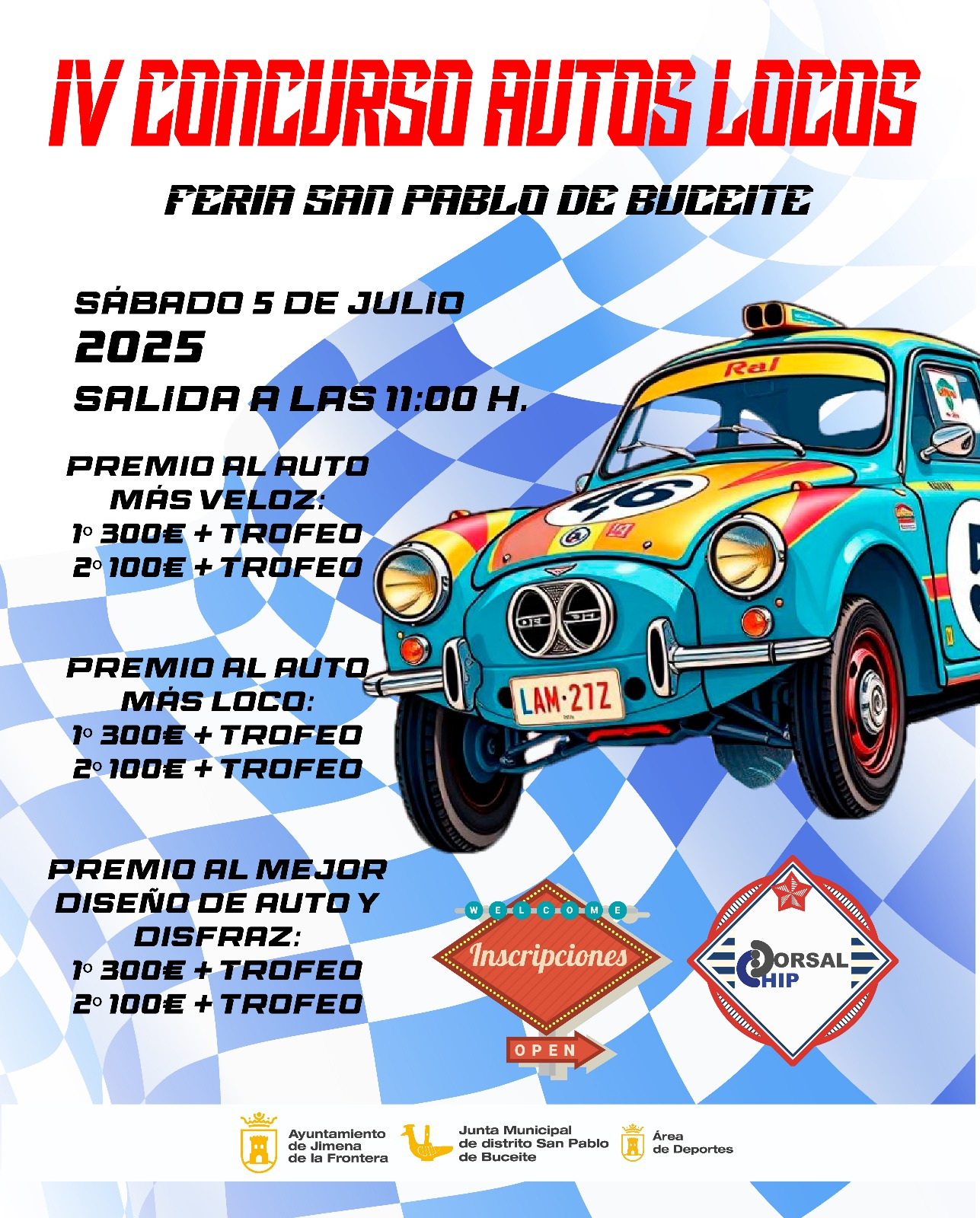 El Área de Deportes del Ayuntamiento de Jimena de la Frontera y la Junta Municipal de Distrito de San Pablo de Buceite han convocado el IV Concurso de Autos Locos, que se celebrará el sábado 5 de julio de 2025 a las 11:00 h.