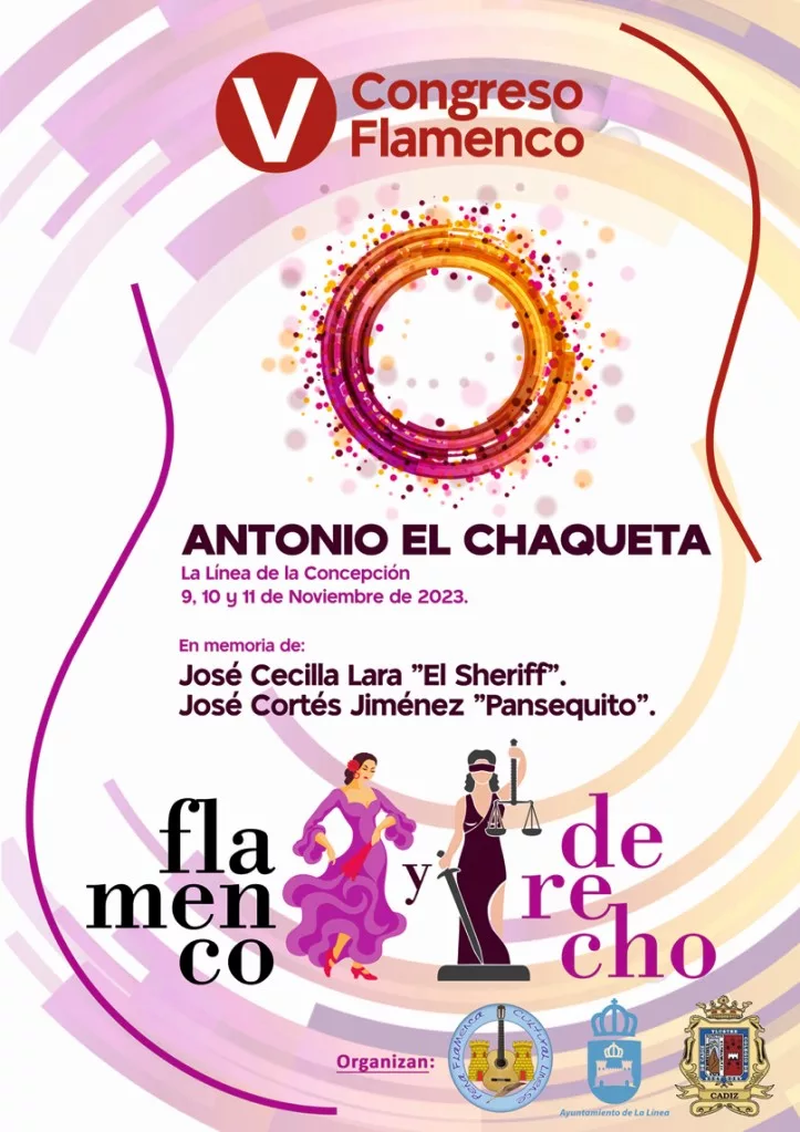 El V Congreso Flamenco ‘Antonio el Chaqueta’ se celebra del 9 al 11 de noviembre en diferentes emplazamientos. Como antesala del evento, el día 9, a las 11 de la mañana, el Teatro Paseo de la Velada acogerá la actividad ‘Los colores del flamenco’ destinada a escolares del municipio. A las 18.00, en la sala Trimope del Palacio de Congresos se celebrará la inauguración, con asistencia del alcalde, Juan Franco; la presidenta de la Mancomunidad de Municipios del Campo de Gibraltar, Susana Pérez Custodio; el vicepresidente segundo de la Diputación de Cádiz, Javier Vidal; el decano del Ilustre Colegio de Abogados de Cádiz, José Adolfo Baturone, y José Luis Moreno, portavoz de la junta gestora de la Peña Flamenca. A las 19.00 horas, el director del Instituto Andaluz del Flamenco de la Junta de Andalucía, Cristóbal Ortega Martos, ofrecerá la primera conferencia, que analizará la Ley 4/2023, de 18 de abril, Andaluza del Flamenco.