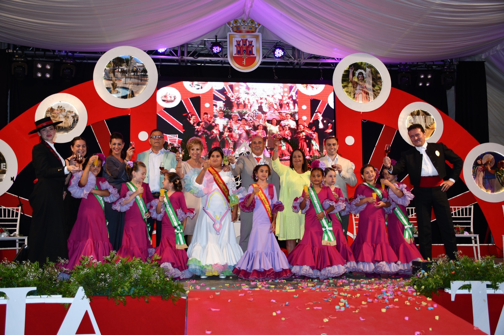 El acto de coronación comenzó con la subida al escenario de las integrantes del cortejo infantil y sus simpáticos acompañantes. Se trata de Maira Rodríguez Merino, Martina Quesada Canas, Azahara Aguilar Sarmiento, María Pacheco Barriga, Nora Gil Díaz, Irene Candón Blanco y Sheila Burrea Pérez. También se contó con la presencia de la reina infantil del año pasado, Valentina Duarte.