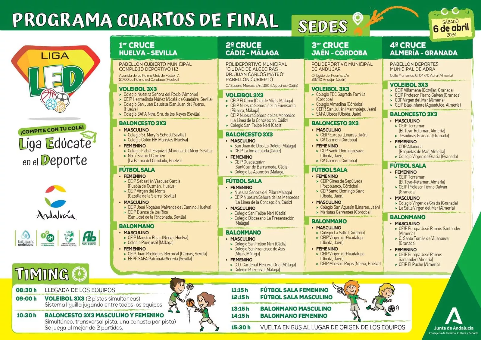 Está previsto la participación del CEIP El Olmo de Mijas; Nuestra Señora de La Fuensanta de Pizarra; Nuestra Señora de las Mercedes de La Línea y San Felipe Neri de Cádiz, todos ellos en la disciplina de Voleibol 3X3. San Juan de Dios LaGoleta de Málaga; CEIP La Inmaculada de Cádiz, y CEIP Guadalquivir de Sanlúcar de Barrameda y La Asunción de Málaga, en la disciplina de Baloncesto 3×3.