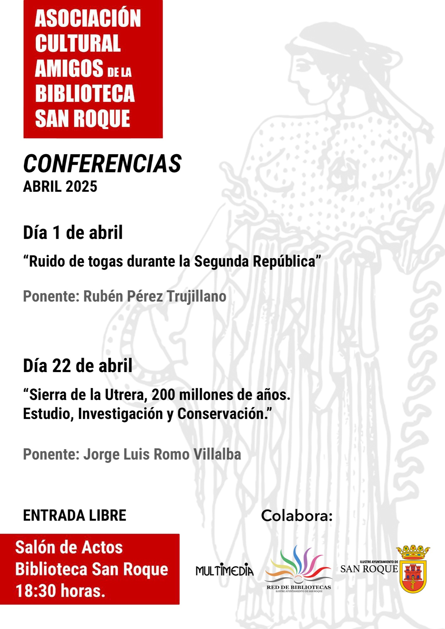 La Asociación Cultural “Amigos de la Biblioteca” de San Roque organiza en el salón de actos del Edificio Diego Salinas dos nuevas conferencias para el mes de abril ambas previstas a las 18.30 horas y con entrada libre hasta completar aforo. Mañana martes tendrá lugar una charla sobre la Segunda República, mientras que el martes 22 habrá otra conferencia sobre la Sierra de la Utrera.