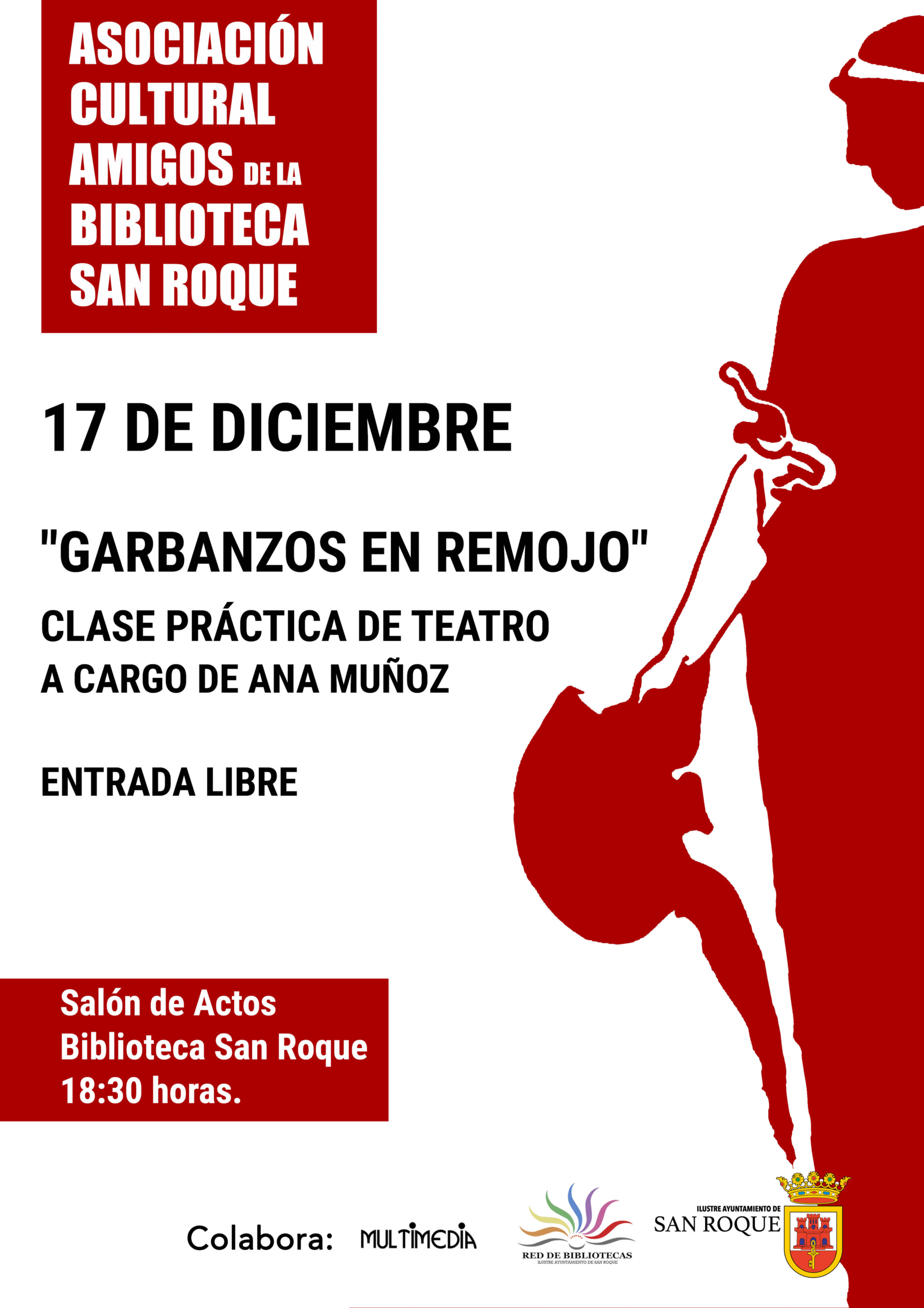 Durante este mes de diciembre, la Asociación Cultural “Amigos de la Biblioteca” ha programado una clase práctica de teatro bajo el título “Garbanzos en remojo” para el martes 17, en el salón de actos de la Biblioteca de San Roque con entrada libre