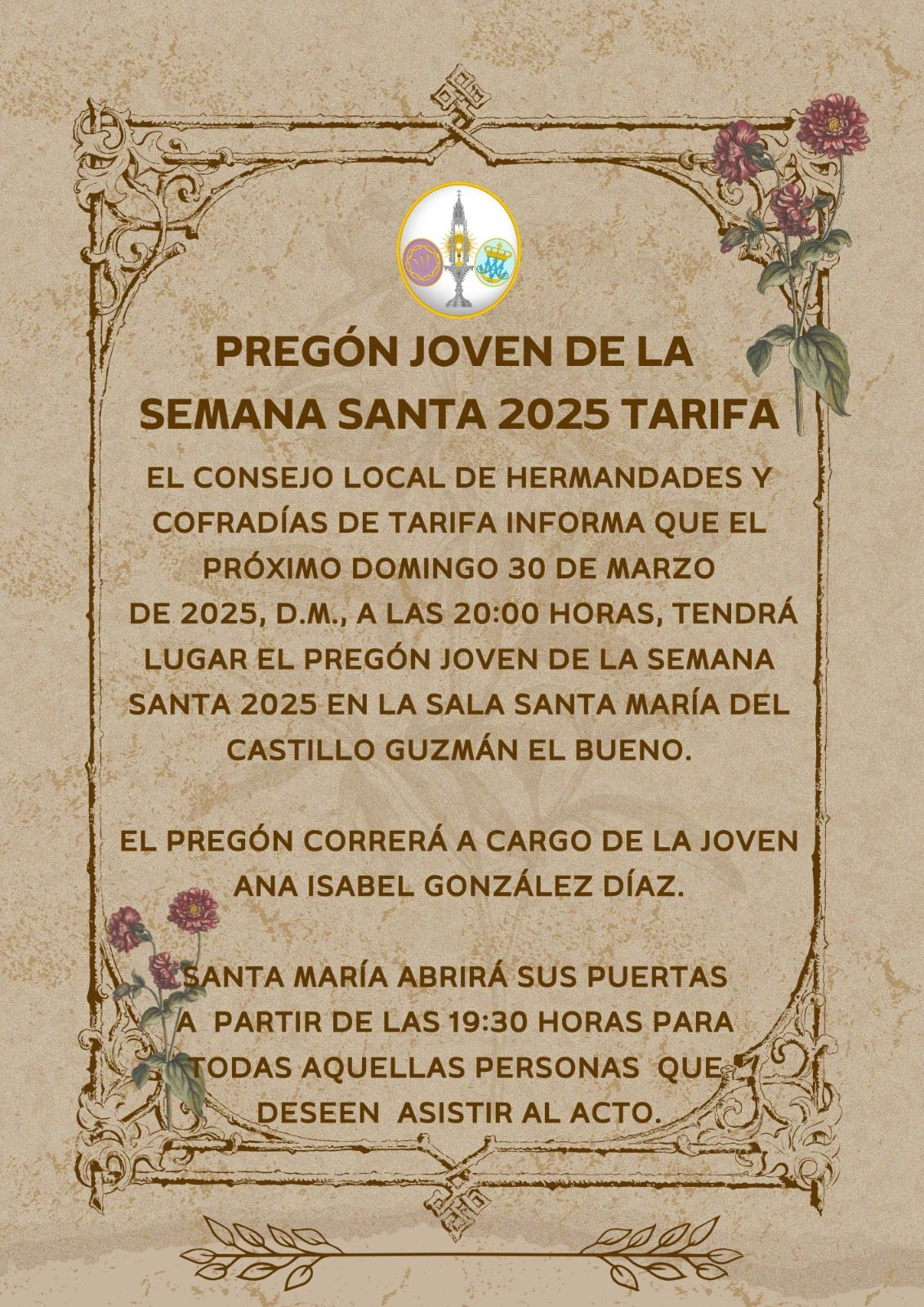 La agenda cofrade continúa este domingo, 30 de marzo, con el pregón juvenil de la Semana Santa 2025, que tendrá lugar a las 20:00 horas en la sala Santa María, ubicada dentro del recinto del Castillo de Guzmán el Bueno.