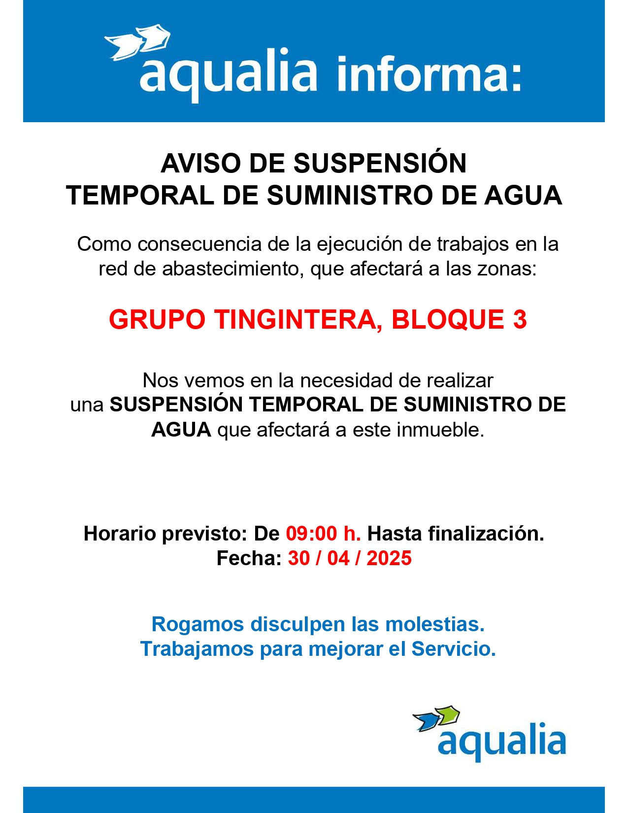 Aqualia programa suspensión temporal de agua en el Bloque 3 del Grupo Tingintera el 30 de abril