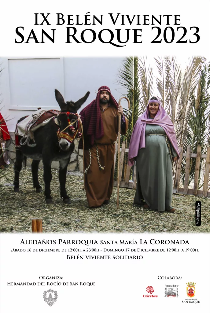 Los aledaños de la Parroquia Santa María La Coronada y en la Plaza de Armas acogerán el fin de semana del 16 y el 17 de diciembre el IX Belén Viviente de San Roque Ciudad, que organiza la Hermandad de Nuestra Señora del Rocío de San Roque con la colaboración del Ayuntamiento y la participación de numerosos colectivos y ciudadanos a título particular. La recaudación se destinará a Cáritas Parroquial San Roque.
