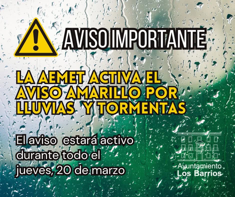 El Ayuntamiento informa que la AEMET ha activado el AvisoAmarillo por lluvias fuertes y tormentas en la comarca.