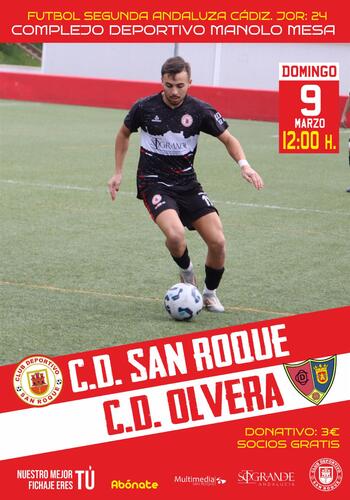 El Club Deportivo San Roque recibirá al CD Olvera en el Campo Municipal Manolo Mesa, en el partido correspondiente a la jornada 24 de Primera Andaluza Cádiz. El choque dará comienzo a partir del mediodía del domingo 9.