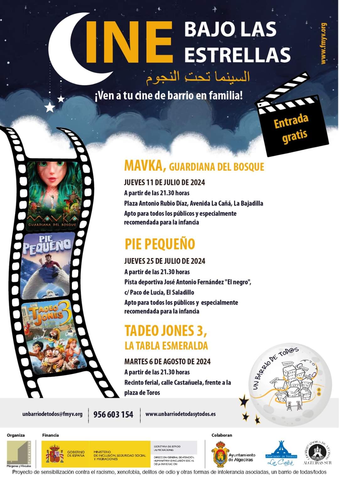 Una iniciativa que abre una cita ya habitual en el verano algecireño que lleva el cine a las plazas y espacios públicos de diferentes barriadas de la ciudad como La Bajadilla, El saladillo, El Recinto Ferial. Frente a la pantalla del Cine bajo las estrellas se reúnen vecinas/os de diferentes orígenes culturales, algunas veces familias enteras, para disfrutar de un rato de ocio, con contenido educacional y cultural con el objetivo de divertirse, convivir y compartir opiniones sobre las temáticas que en las películas se tratan.