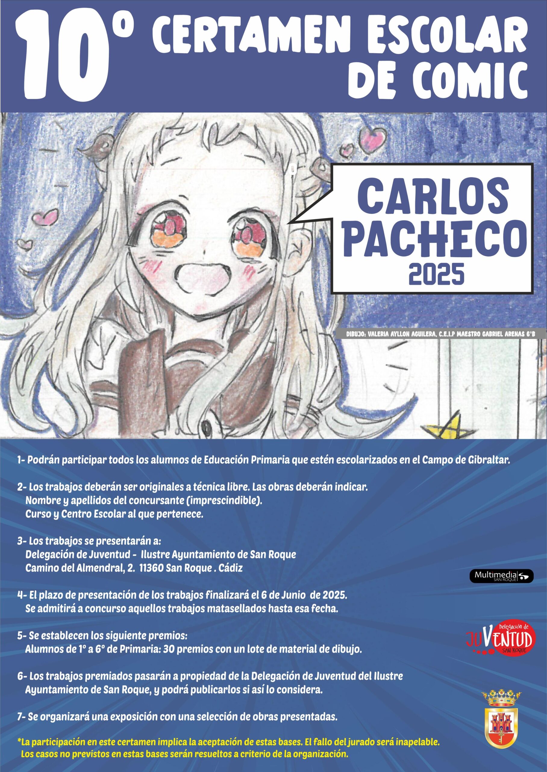 La Delegación de Juventud, que dirige el teniente de alcalde David Ramos, convoca el X Certamen Escolar de Cómic Carlos Pacheco, en el que pueden participar alumnos de Primero a Sexto de Primaria del Campo de Gibraltar. El plazo de presentación de trabajos finaliza el próximo 6 de junio. Se concederán 30 premios, consistentes en lotes de material de dibujo, y se organizará una exposición con las obras más destacadas.