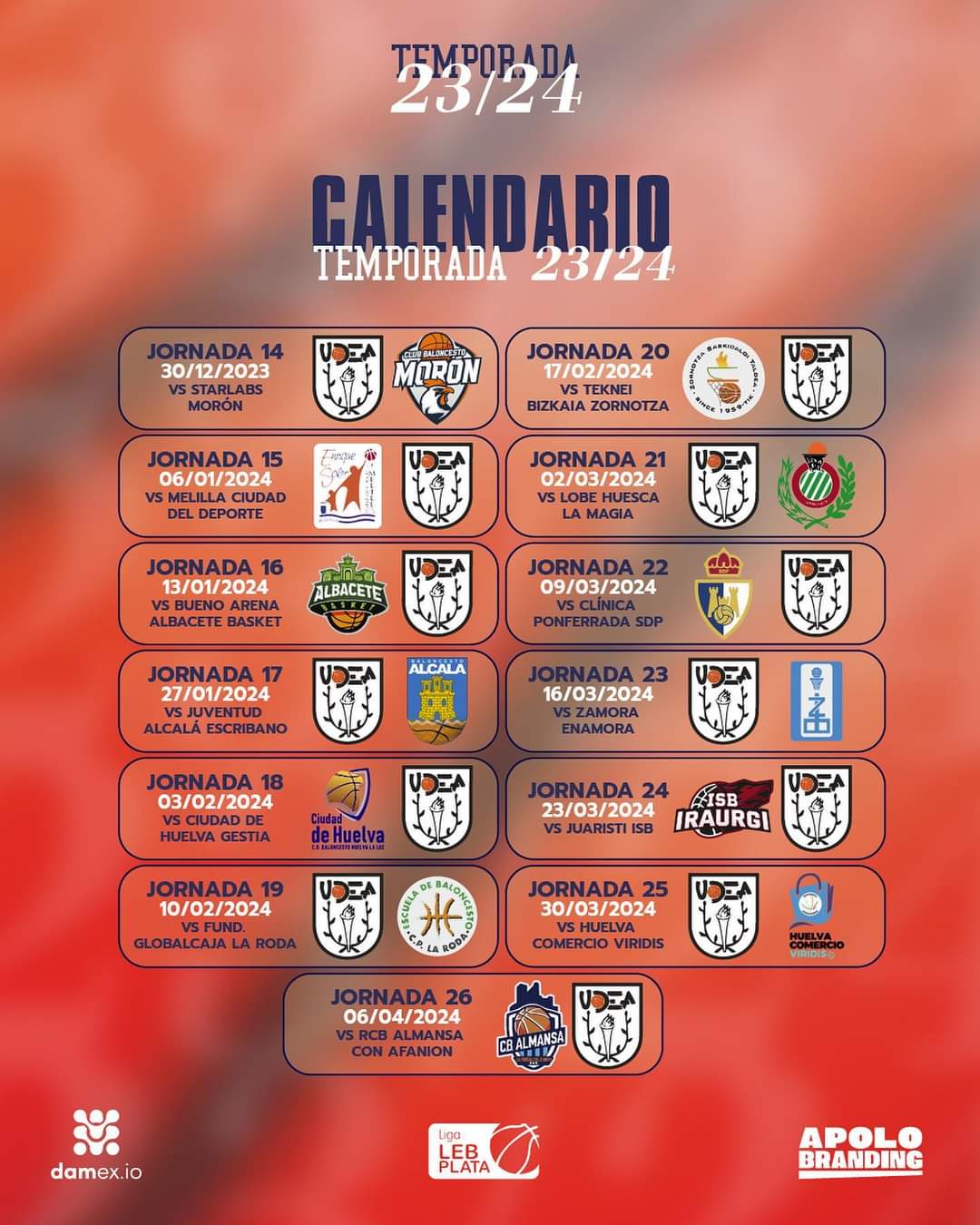 Damex Udea Algeciras comienza la Liga 2023-2024 en la Leb Plata el próximo 7 de octubre en Morón, enfrentándose al equipo sevillano. El sorteo hecho público hoy ha decidido que el equipo algecireño comience fuera la competición, y que termine la Liga regular jugando fuera frente a Almansa, el 6 de abril. Sólo habrá dos jornadas en miércoles, el 1 de noviembre y el 20 de diciembre.