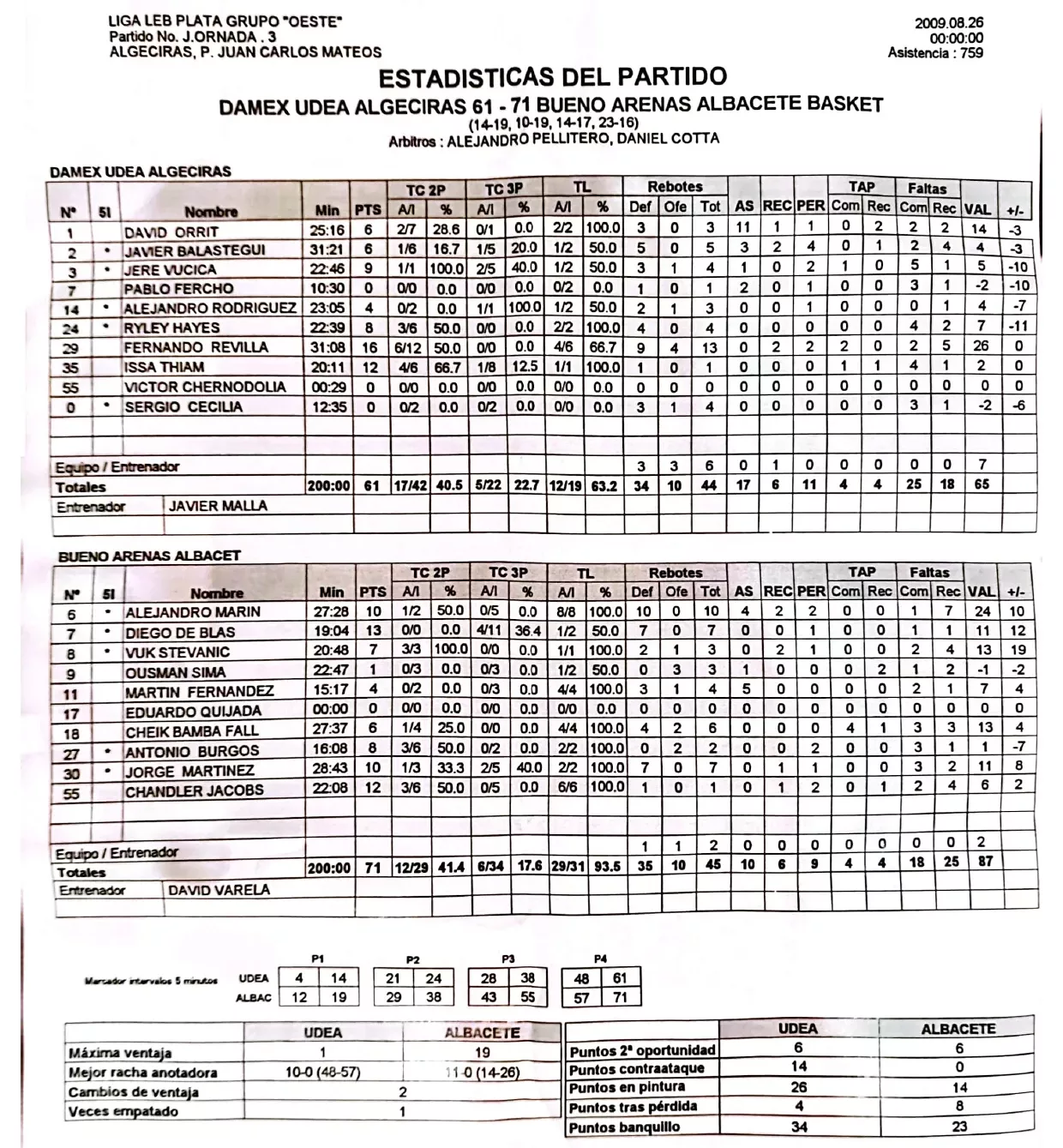 El partido empezó como de costumbre, perdidas e imprecisiones del equipo local que los manchegos aprovechaban para irse en el marcador gracias a Diego de Blas. La entrada de Orrit hizo que los udeistas reaccionaran y se acercaron a igualar el marcador, pero una serie de tiros libres finales de Albacete le dio al equipo visitante una ventaja de 5 puntos al final del cuarto (14-19)
