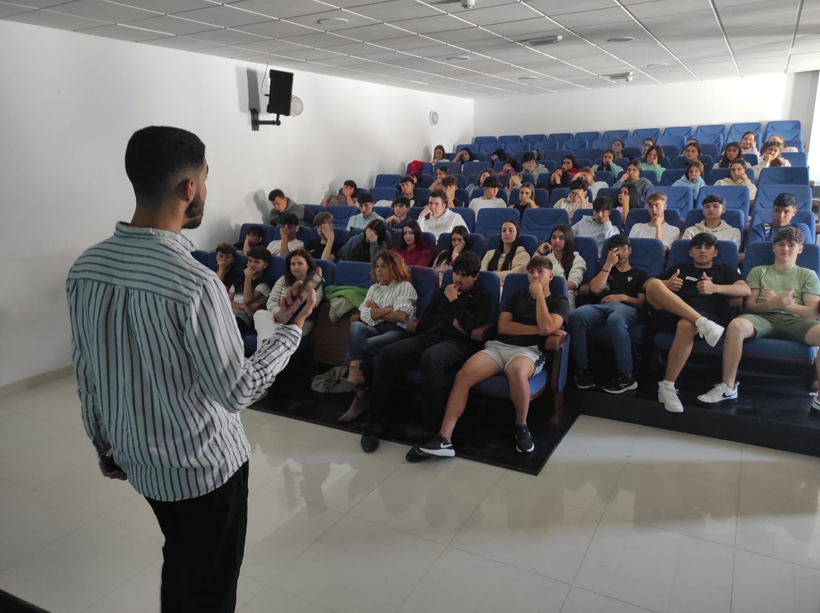 Escolares adolescentes de cuarto de la ESO y primero de Bachillerato de los IES Almadraba y Baelo Claudia han seguido hoy de cerca las explicaciones del tarifeño Diego Maldonado Guzmán, doctor en Criminología y experto en prevención del “ciberacoso”.