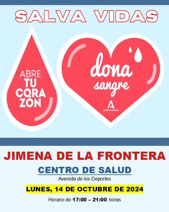 El Lunes 14 de Octubre de 2024, el Centro de Salud de Jimena de la Frontera acogerá una nueva donación de sangre entre las 17:00 y las 21:00 horas.