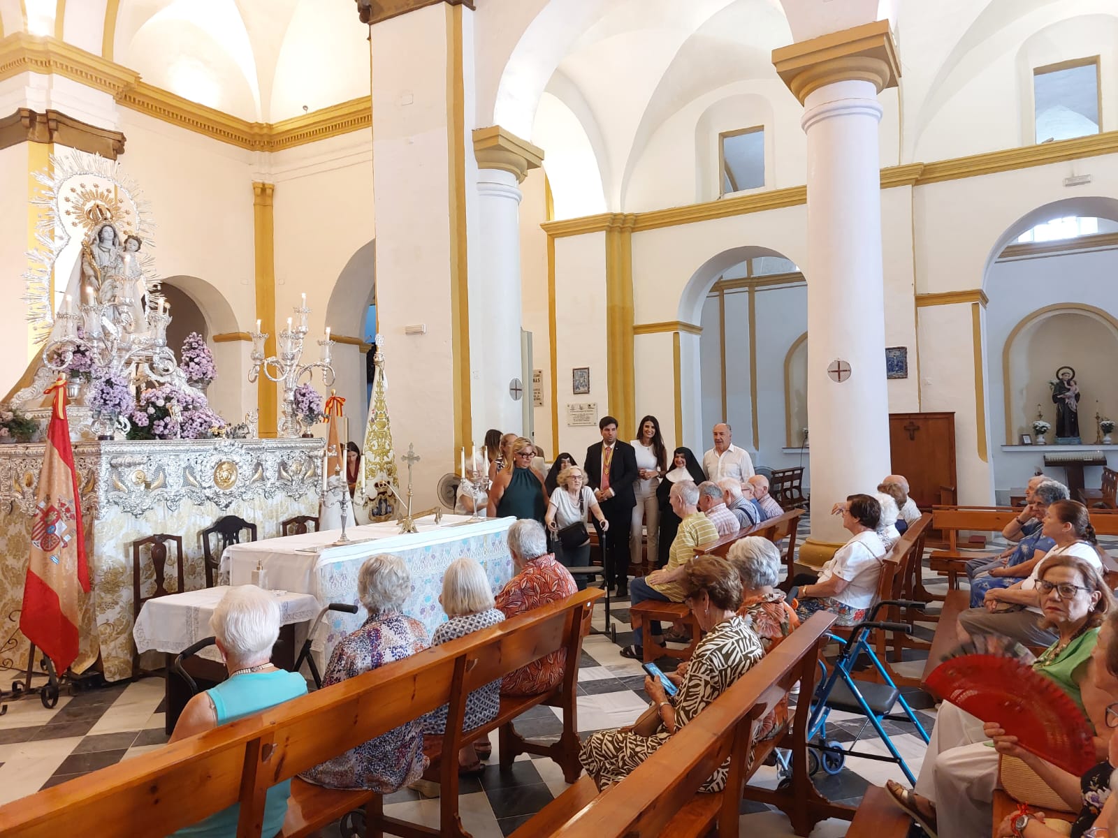 El alcalde de Algeciras, José Ignacio Landaluce, acompañado por la concejal delegada de Atención al Mayor, Patricia Bueno, y el hermano mayor de la Hermandad de la Palma, Ismael Villa, ha participado esta mañana en uno de los actos más emotivos de las fiestas patronales: el paso de los mayores bajo el manto de Nuestra Señora de la Palma, Patrona y Alcaldesa Perpetua de la ciudad.