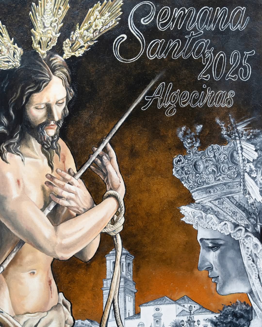 Este año el cartel de la semana Santa, del artista barreño, Valentín Rivera, es una pintura que recoge la imagen de Jesús Coronado de Espinas. Por us parte, el autor, que es de Los Barrios y tiene una gran vinculación con la Semana Santa de Algeciras, realizó una ilustró a los presentes sobre el sentido y el desarrollo de su obra.