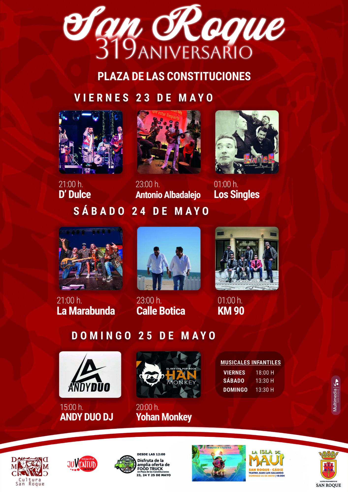 Por otro lado, desde la organización de los “foodtrucks” se han programado varias actividades en la Plaza de las Constituciones. Así, el viernes a las 18 horas, el sábado a las 13 horas y el domingo a las 13.30 horas habrá musicales infantiles. El domingo a las 15.00 horas se contará con la música del dj algecireño Andy Duo, y ese día a partir de las 20.00 horas actuará el cantante brasileño de rock Yohan Monkey.