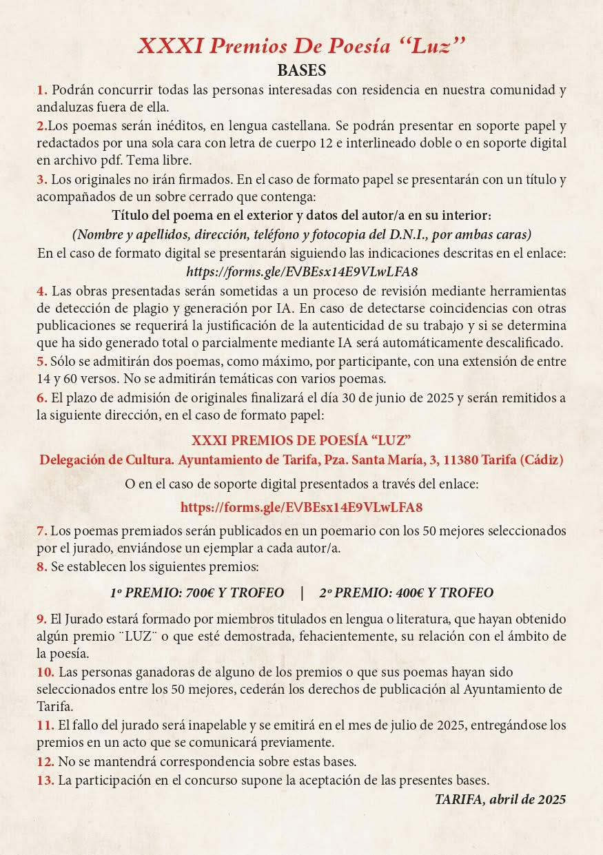 La delegación municipal de Cultura de Tarifa ha convocado la trigésimo primera edición del Premio de Poesía Luz, invitando a participar a todas las personas interesadas con residencia en la comunidad andaluza o fuera de ella hasta el próximo 30 de junio de 2025.