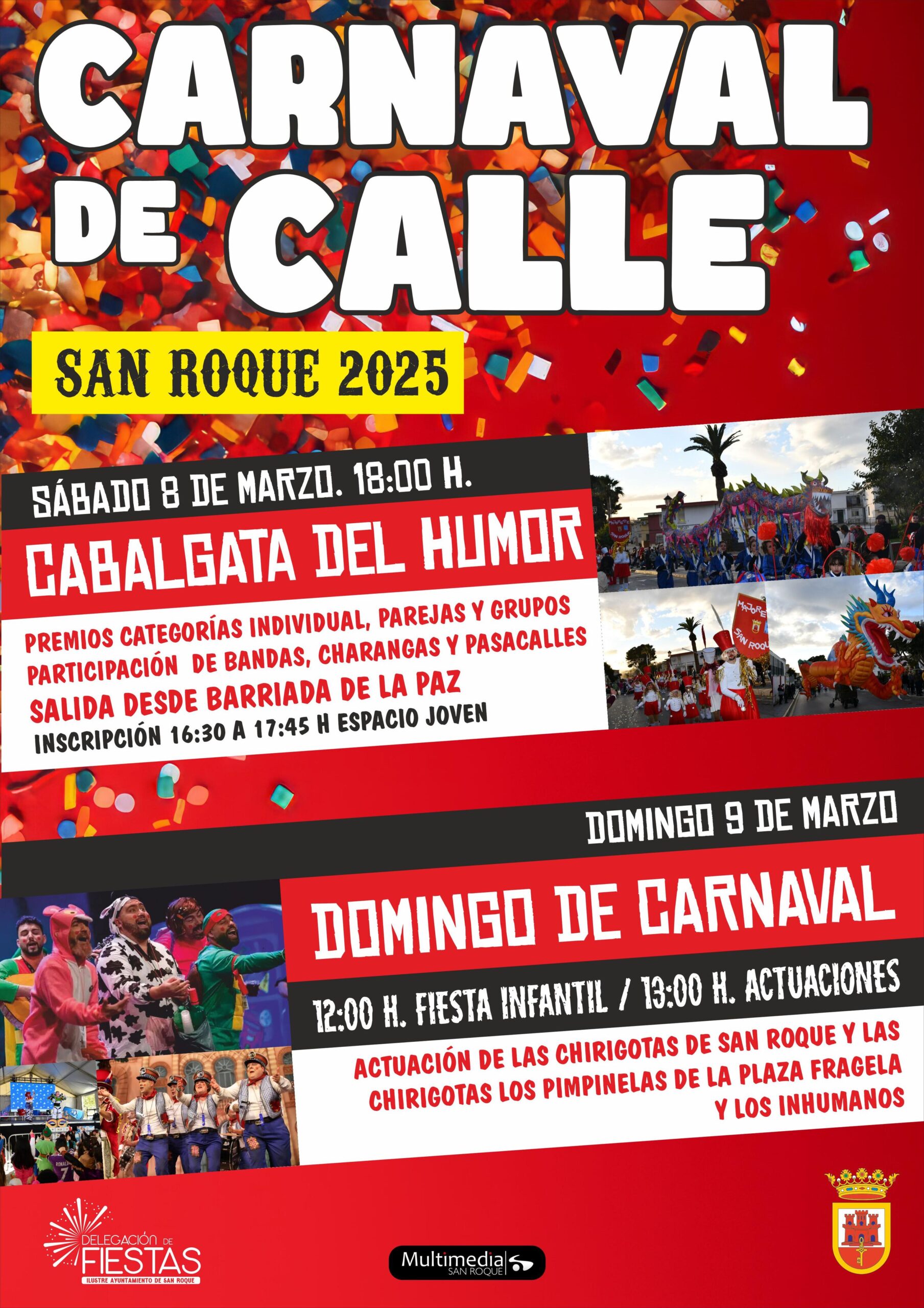En cuanto al Carnaval de Calle, el de San Roque Ciudad, tendrá lugar el sábado 8 y el domingo 9 de marzo. El sábado, a partir de las 18.00 horas, se desarrollará la Cabalgata del Humor, con salida desde la Barriada de la Paz, para finalizar en la Alameda Alfonso XI. Habrá premios en las categorías de individual, parejas y grupos, y se contará con la participación de bandas, charangas y pasacalles. La inscripción en el concurso será en el Espacio Joven entre las 16.30 y las 17.45 horas. A su finalización, en la carpa de la Alameda Alfonso XI se procederá a la entrega de premios.