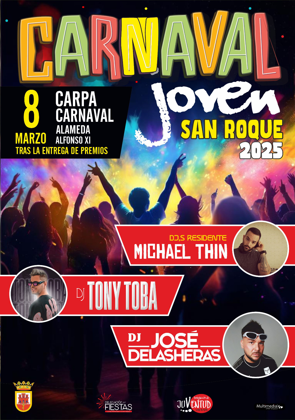 Con la organización de la Delegación de Juventud, a partir de las 22.00 horas habrá una Fiesta Joven de Carnaval en la carpa de la Alameda, a la que pondrán música los Djs Michael Thin, Tony Toba y José de las Heras. Se pide a los asistentes que acudan disfrazados y con ganas de pasarlo bien.