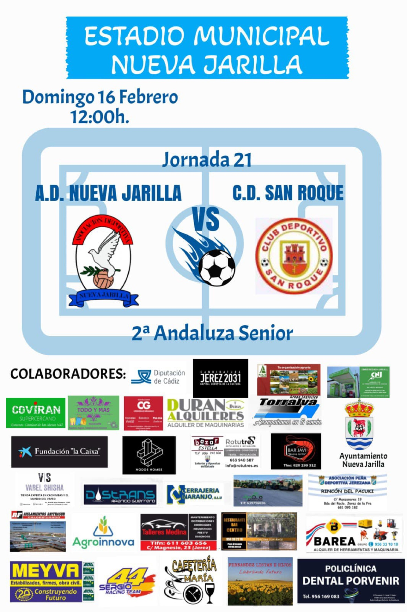 El Estadio Municipal de Nueva Jarilla acogerá este domingo a mediodía el partido entre el equipo local y el CD San Roque, correspondiente a la jornada 21 de Segunda Andaluza Cádiz. Los rojillos tendrán una nueva oportunidad de colocarse líderes en caso de victoria, aunque el conjunto de la pedanía jerezana no se lo pondrá fácil, porque también tiene aspiraciones.