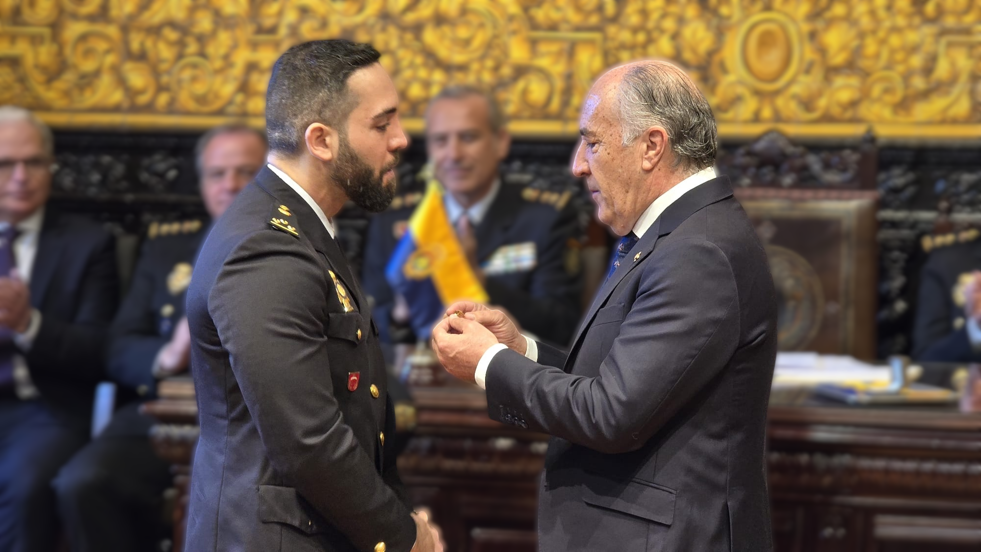 El alcalde, José Ignacio Landaluce, José Ignacio Landaluce, junto a la totalidad del equipo de gobierno ha hecho entrega de la insignia de la ciudad al inspector jefe de la Policía Nacional Francisco Javier González Suárez en el Salón de Plenos de la Casa Consistorial.