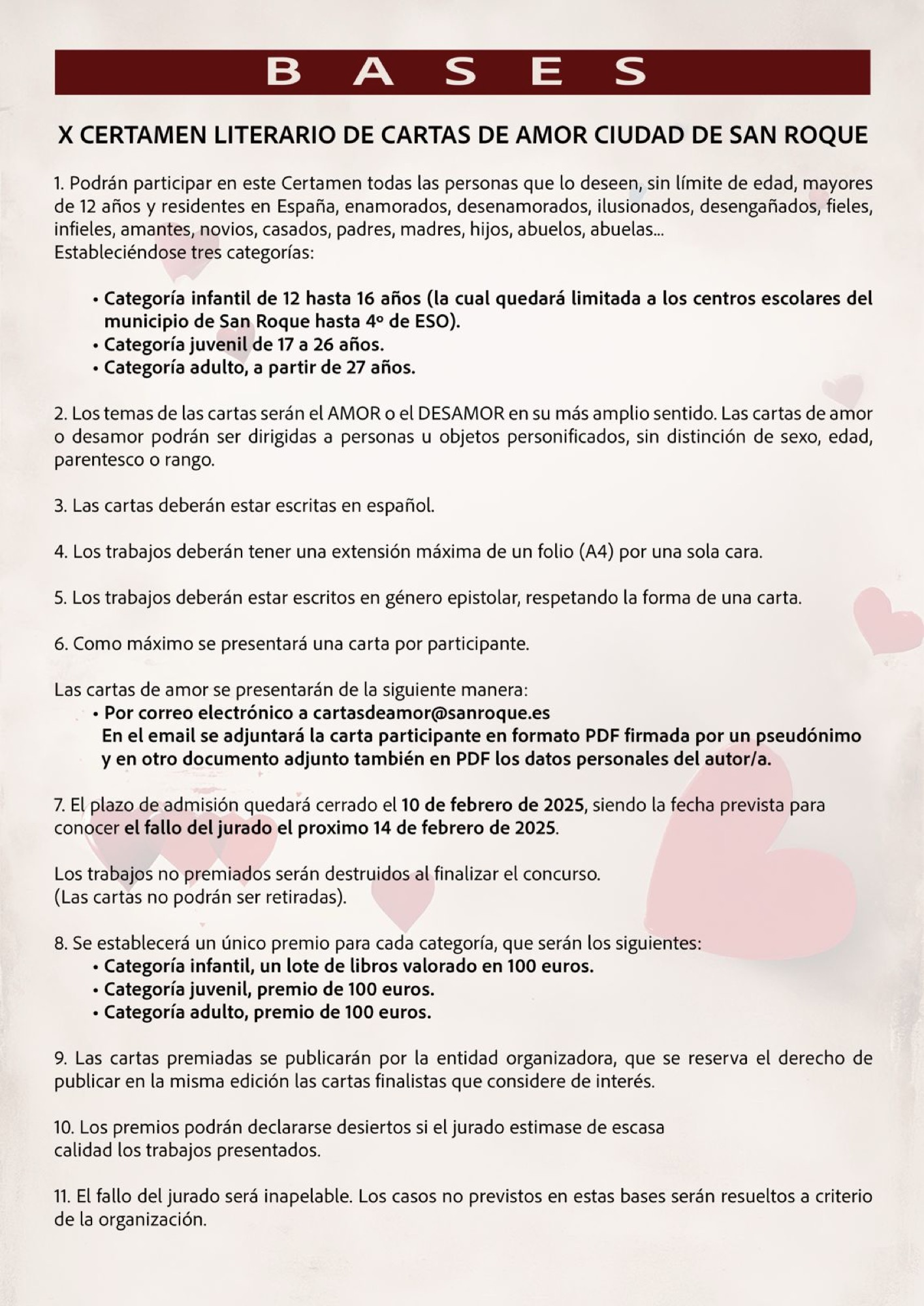En las bases del X Certamen Literario de Cartas de Amor “Ciudad de San Roque” se indica que pueden participar “todas las personas que lo deseen sin límite de edad, mayores de 12 años y residentes en España, enamorados, desamorados, ilusionados, desengañados, fieles, infieles, amantes, novios, casados, padres, madres, hijos, abuelos, abuelas…”.