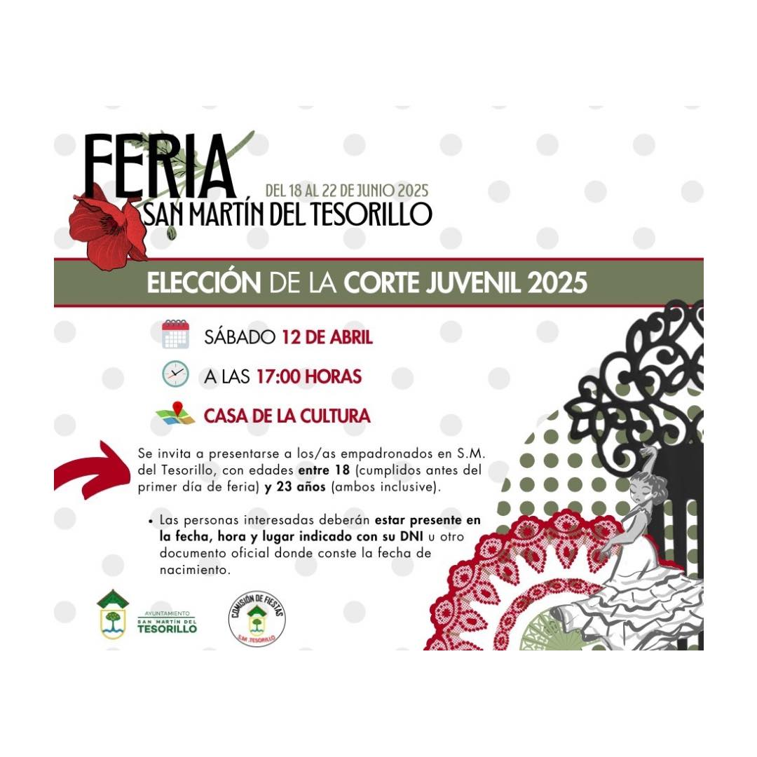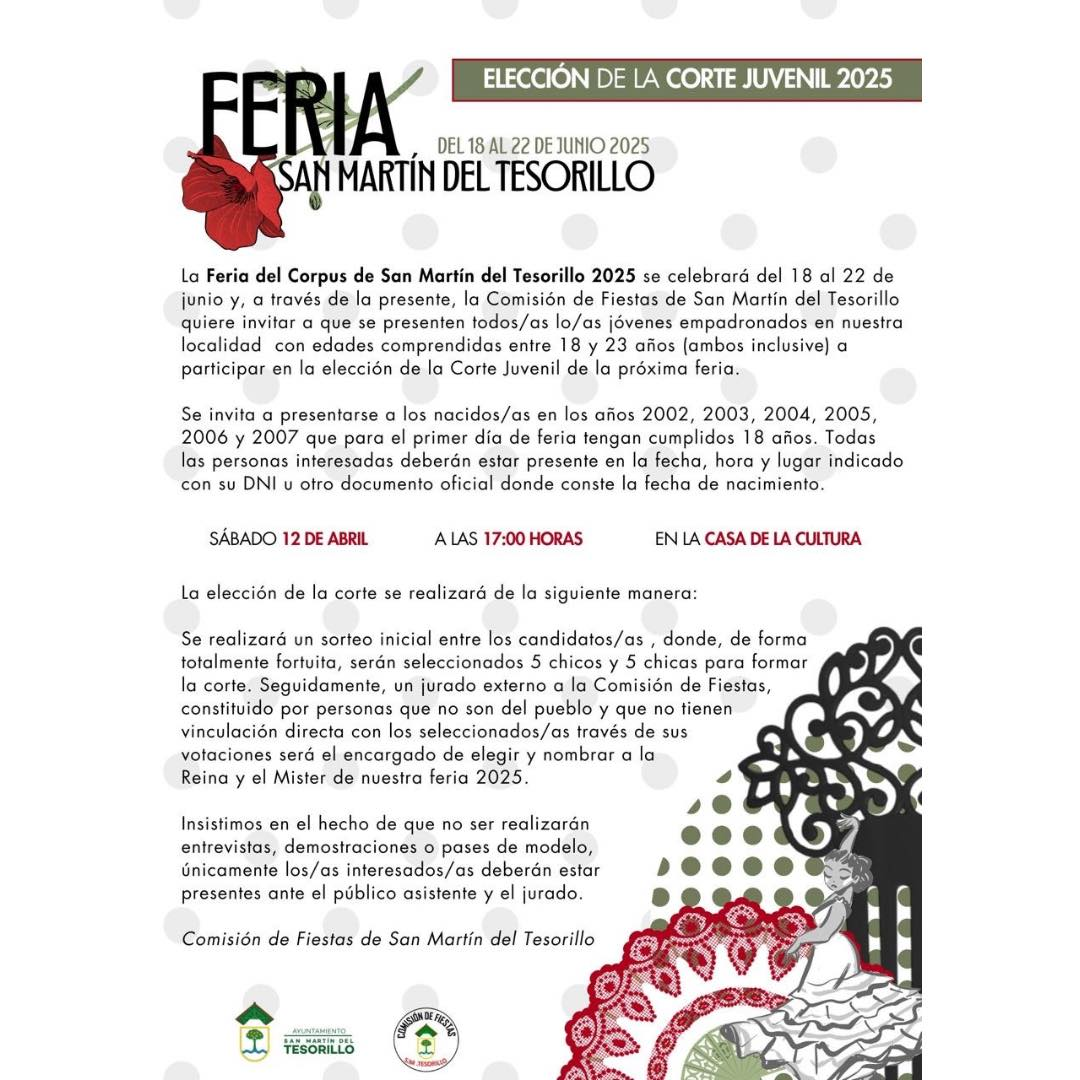 La Feria del Corpus de San Martín del Tesorillo 2025 se acerca, y como parte de los actos previos se ha convocado la elección de la Corte Juvenil. La convocatoria está dirigida a jóvenes empadronados en la localidad, con edades comprendidas entre los 18 y 23 años, nacidos en los años 2002, 2003, 2004, 2005, 2006 y 2007, que para el primer día de feria hayan cumplido 18 años.