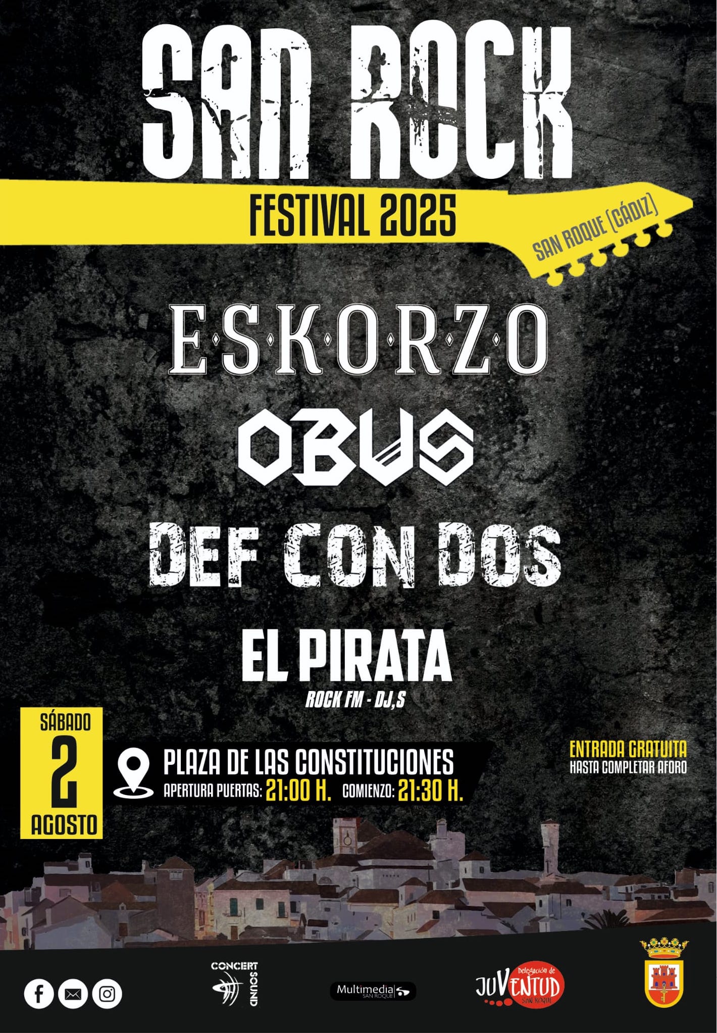 Tres de las bandas más grandes del rock nacional y uno de los Dj españoles más importantes de este género se darán cita el próximo sábado 2 de agosto en la Plaza de las Constituciones con motivo de una nueva edición del San Rock Festival. La banda granadina Eskorzo, los míticos Obús, los impactantes Def Con Dos y el veterano locutor El Pirata ofrecerán esa noche un gran abanico de estilos, desde la fusión con ritmos globales hasta el heavy metal, pasando por el hip hop más cañero.