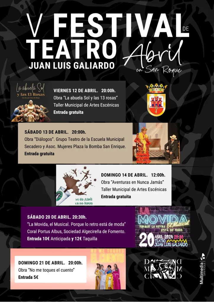 Un total de cinco espectáculos, tres de ellos gratuitos, componen el V Festival de Teatro “Juan Luis Galiardo”, que se representarán en el teatro con el nombre del gran actor sanroqueño, al que se rinde homenaje con esta actividad. Organiza la Delegación de Cultura del Ayuntamiento de San Roque, y tendrá lugar entre los días 12 y 21 de abril.