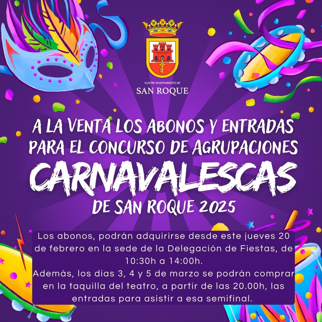 La Delegación de Fiestas del Ayuntamiento de San Roque pone a la venta este jueves al precio de 25 euros el abono para asistir al Concurso Oficial de Agrupaciones Carnavalescas (COAC), que se celebrará los días 3, 4, 5, y 7 de marzo con la participación de agrupaciones de toda la comarca así como de otras invitadas desde el Carnaval de Cádiz. En cuanto a las entradas de cada sesión, costarán 10 euros y se venderán durante el certamen.