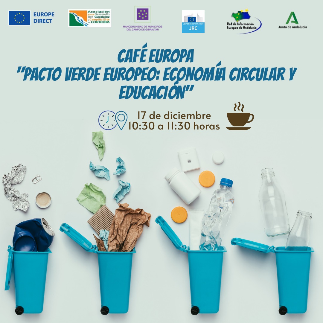 Los centros Europe Direct Campo de Gibraltar y Europe Direct Andalucía Rural (Baena) colaborarán nuevamente en la celebración de la próxima edición de la iniciativa Café Europa que, en la presente ocasión, tendrá como eje central el Pacto Verde Europeo, la Economía Circular y sus repercusiones en el campo de la sostenibilidad, la neutralidad climática y el cuidado medioambiental, al constituir las tres líneas estratégicas del desarrollo de Europa en el campo económico y social.