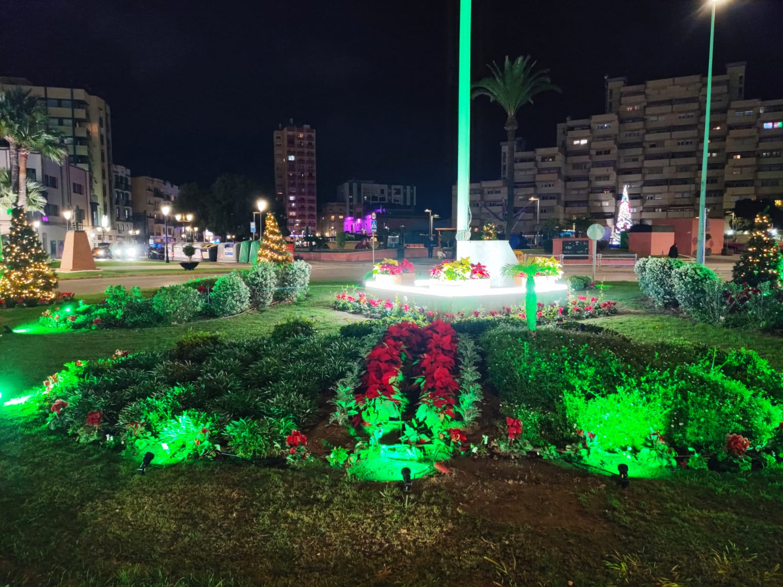La rotonda dispone además de iluminación, tanto en los abetos con leds navideños, como focos leds de color verde, con tiras de led blanco alrededor de la peana de la bandera.