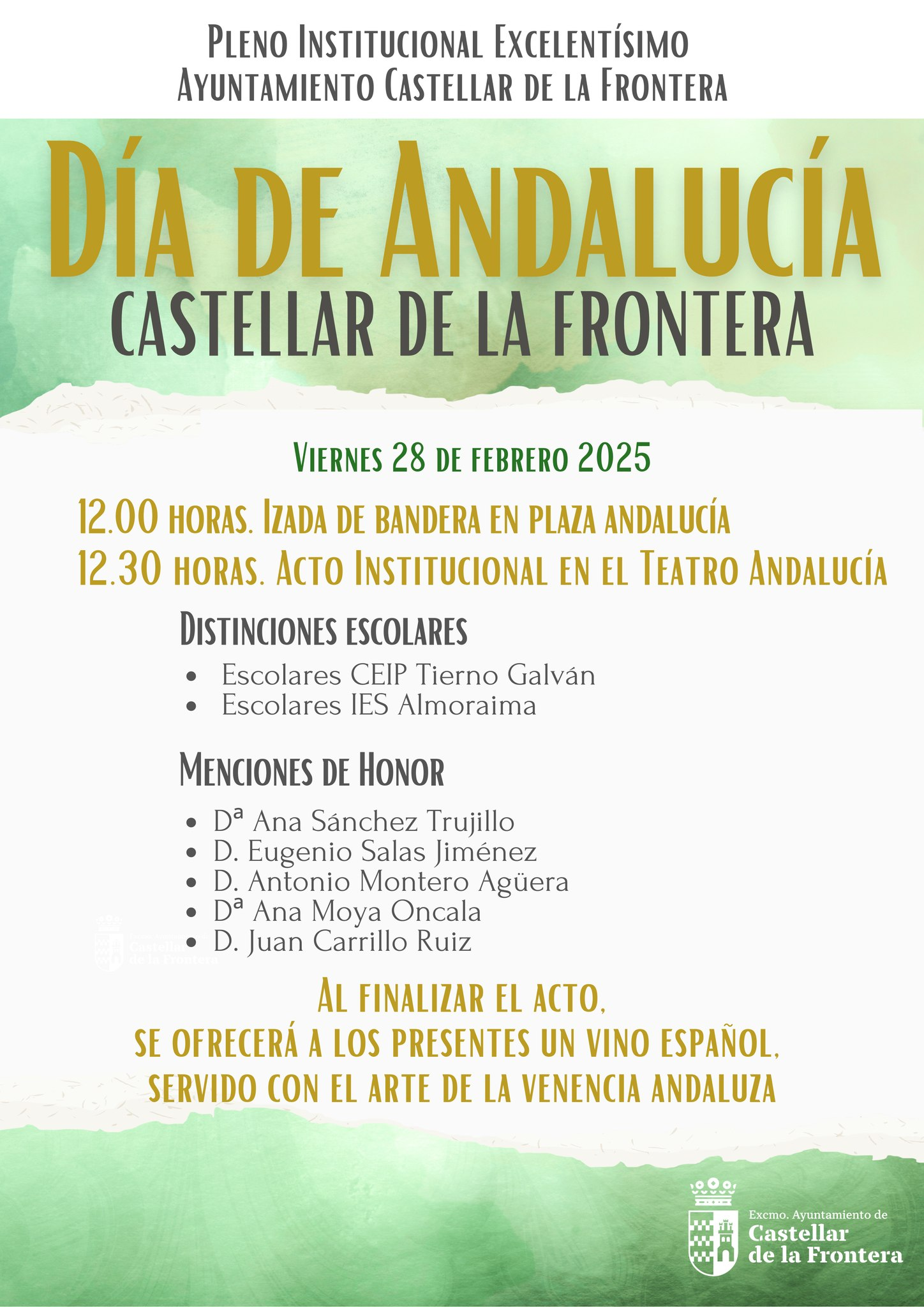 El viernes 28 de febrero de 2025, en el Teatro Andalucía, se llevará a cabo el Pleno Institucional del Día de Andalucía, un acto en el que se reconocerá a cinco vecinos destacados por su trayectoria y aportación a la comunidad chisparrera. La jornada se iniciará a las 12:00 horas con la izada de bandera en Plaza Andalucía, seguida a las 12:30 horas por el pleno institucional en el Teatro Andalucía.