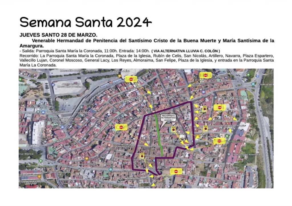 La Venerable Hermandad de Penitencia del Santísimo Cristo de la Buena Muerte y María Santísima de la Amargura tiene prevista su salida desde la Parroquia Santa María la Coronada a las 11 de la mañana, siendo la recogida en el mismo templo a las 14 horas.