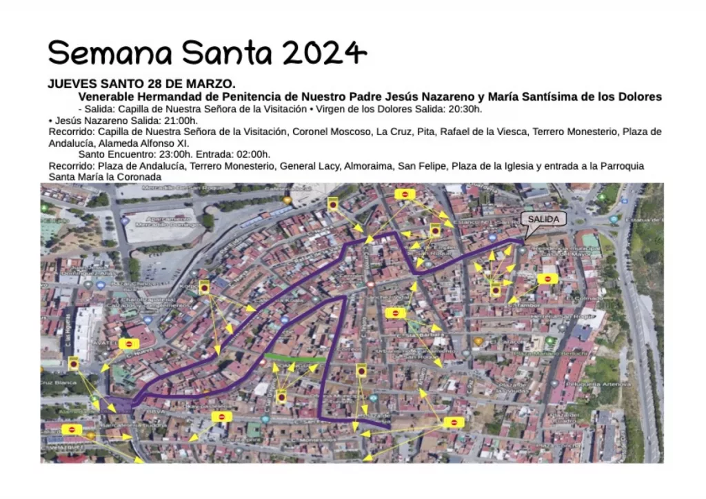 El itinerario es desde Capilla de Nuestra Señora de la Visitación, Coronel Moscoso, Cruz, Pita, Rafael de la Viesca, Terrero Monasterio, Plaza de Andalucía, Alameda Alfonso XI. A las 23 horas se producirá el Santo Encuentro, y tras el mismo ambos pasos discurrirán por Alameda Alfonso XI, Plaza de Andalucía, Terrero Monesterio, General Lacy (Carrera Oficial), Almoraima, San Felipe, Plaza de la Iglesia y entrada en la Parroquia Santa María la Coronada.