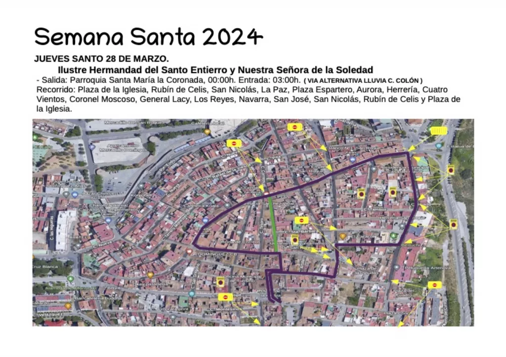 El itinerario es desde la Parroquia Santa María la Coronada, Plaza de la Iglesia, Rubín de Celis, San Nicolás, La Paz, Plaza Espartero, Vallecillo Luján, Aurora, Herrería, Cuatro Vientos, Coronel Moscoso, General Lacy (Carrera Oficial), Los Reyes, Almoraima, San Felipe, Plaza de la Iglesia y entrada en la Parroquia Santa María la Coronada.
