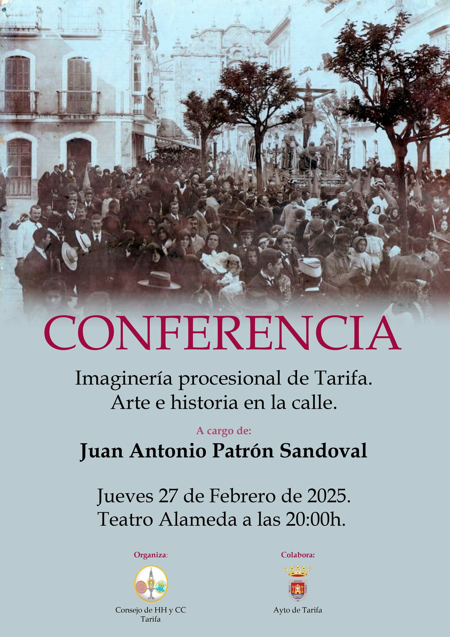 El tarifeño Juan Antonio Patrón Sandoval, de la mano del Consejo Local de Hermandades y Cofradías de la parroquia de Tarifa, ofrecerá mañana, jueves 27 de febrero de 2025, una conferencia abierta al público titulada «Imaginería procesional de Tarifa. Arte e historia en la calle». La cita, que dará inicio a las 20:00 horas en el Teatro Municipal Alameda, forma parte de la Conferencia I organizada por el mencionado Consejo en colaboración con el Excmo. Ayuntamiento de Tarifa.
