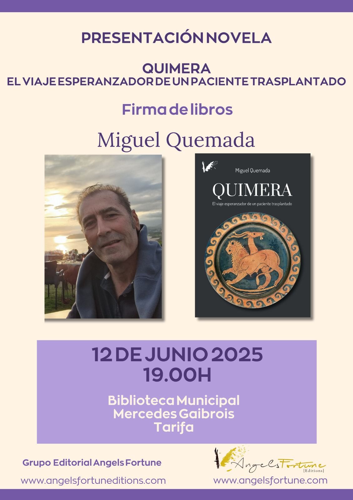 “Quimera. El viaje esperanzador de un paciente trasplantado” ha sido editado por el sello Angels Fortune. Durante el acto en Tarifa, Miguel Quemada compartirá con el público las vivencias y relatos que dan forma a esta obra, ofreciendo una perspectiva personal sobre la experiencia del trasplante y el poder regenerador de la ciencia.