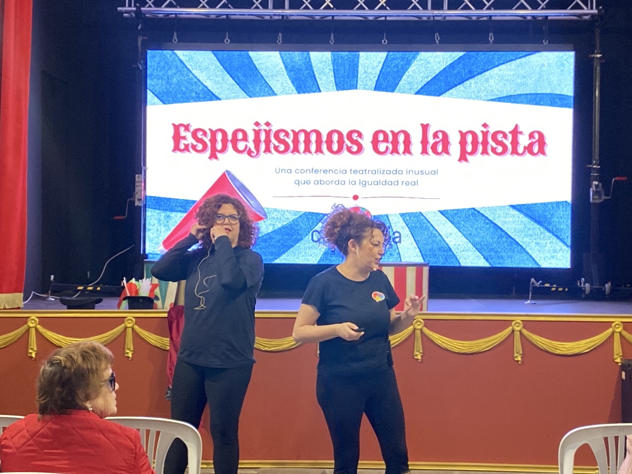 De un modo ameno y divertido, Susana Ginesta, licenciada en Derecho, máster en Género, Identidad y Ciudadanía y experta en Comunicación, y Tatiana Sánchez, psicóloga y experta en sexualidad, han puesto en evidencia la brecha existente entre la igualdad legal, prevista y contemplada en el ordenamiento jurídico, y la igualdad real, centrándose en tres ámbitos: la conciliación y el techo de cristal; los estereotipos de género y la presión estética, como barreras que afectan al desarrollo y la progresión de la mujer en la sociedad. Todo ello con el mundo del circo como hilo conductor de la representación escénica que para su interesante y didáctica exposición han llevado a cabo.