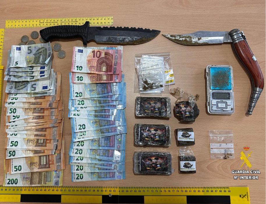 Los Guardias Civiles, mediante Autorización Judicial, realizaron la entrada y registro de la vivienda, dando como resultado la aprehensión de sustancias estupefacientes dispuestas para su venta en pequeñas dosis, más de 1.700 euros de dinero en efectivo, una báscula de precisión y diferentes útiles de los comúnmente utilizados para la venta de sustancias estupefacientes.