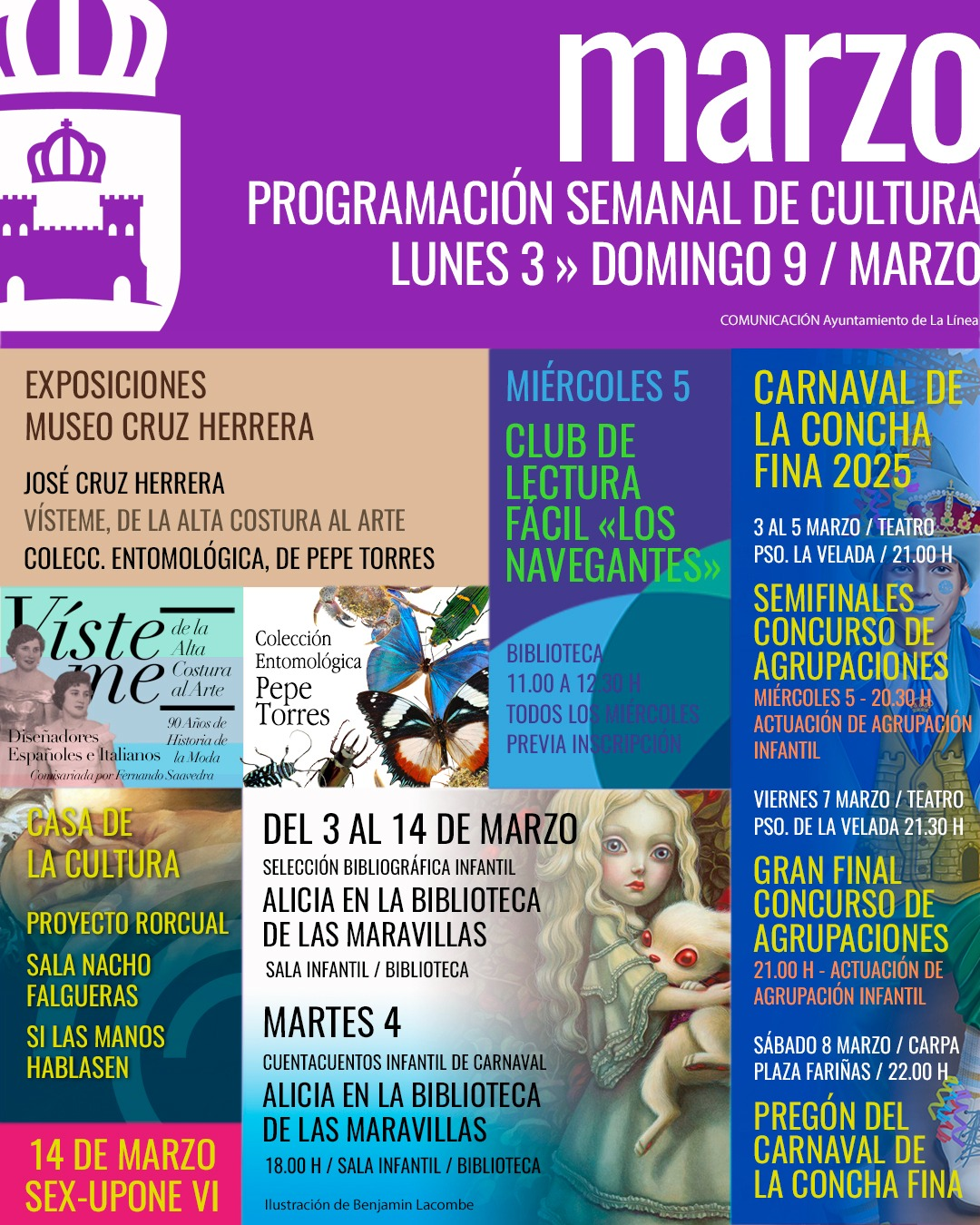 La Línea de la Concepción ofrece, del lunes 3 al domingo 9 de marzo, una variada programación cultural y festiva que abarca desde exposiciones y actividades de fomento de la lectura hasta los preparativos del Carnaval de la Concha Fina 2025.