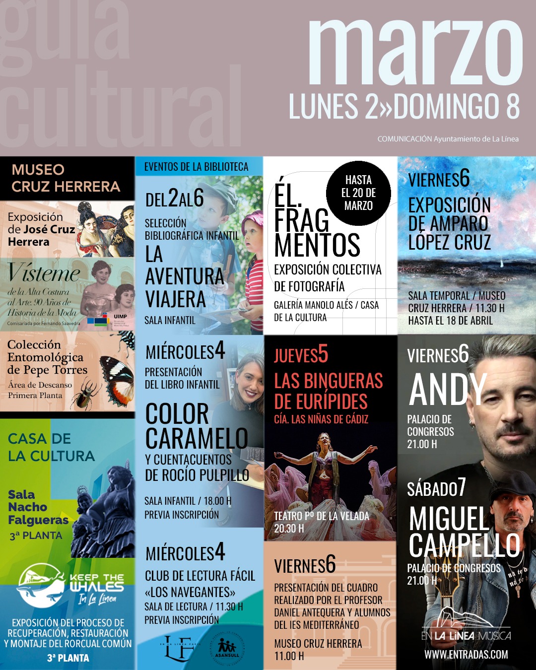 La Delegación de Cultura del Ayuntamiento de La Línea de la Concepción ha presentado la programación prevista entre el lunes 2 y el domingo 8 de marzo, con propuestas que abarcan artes plásticas, literatura, teatro y música en distintos espacios municipales.