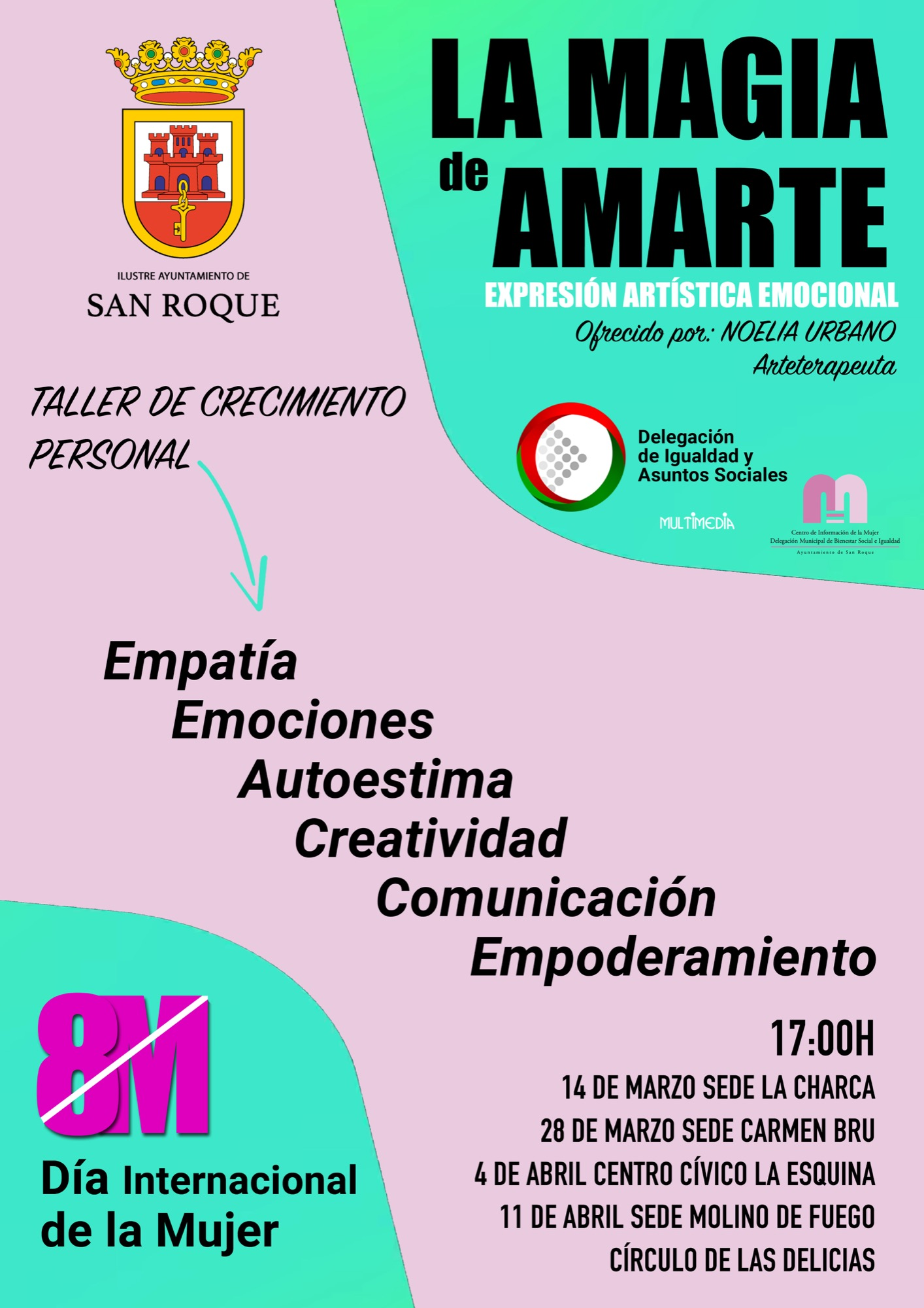 La Delegación de Igualdad y Asuntos Sociales  del Ayuntamiento de San Roque ha organizado el taller de expresión artística emocional, “La magia de amarte” ofrecido por la arteterapeuta Noelia Urbano. Esta actividad se desarrollará en cuatro puntos del municipio y se dirige a las integrantes de asociaciones de mujeres.