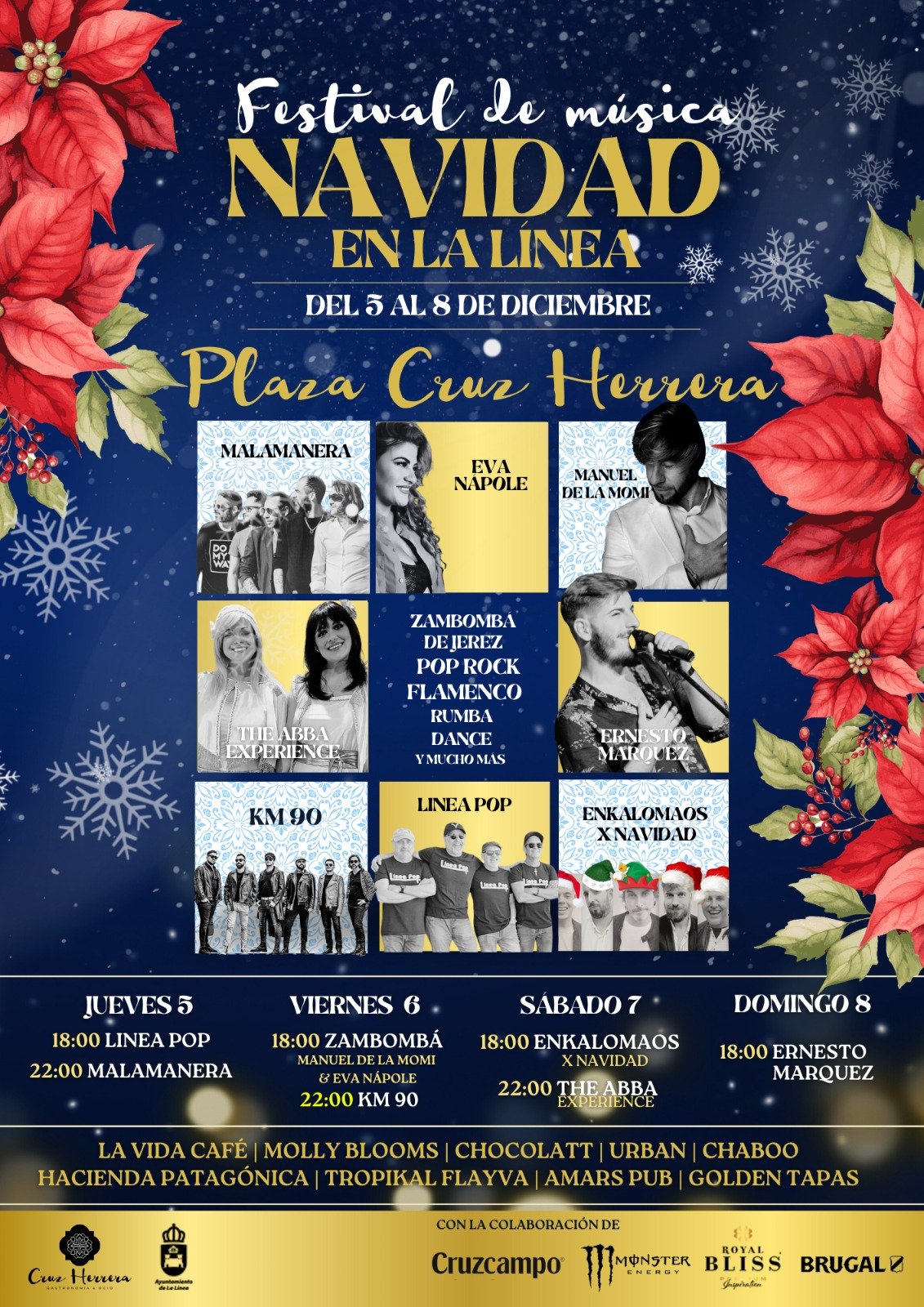 El jueves, 5 de diciembre, actuarán Línea Pop a las seis de la tarde y Malamanera a las diez de la noche. El 6 de diciembre, a las 18 horas, habrá una zambomba con Manuel de la Momi y Eva Nápole y a las 22.00 la banda KM 90. La jornada del sábado, 7 de diciembre, contará primero con Enkalomaos X Navidad, y con The Abba Experience, después. La última de las actuaciones será la de Ernesto Márquez, el domingo 8 de diciembre, a las 18 horas. Se prevé que todas actuaciones terminen a las 12 de la noche.