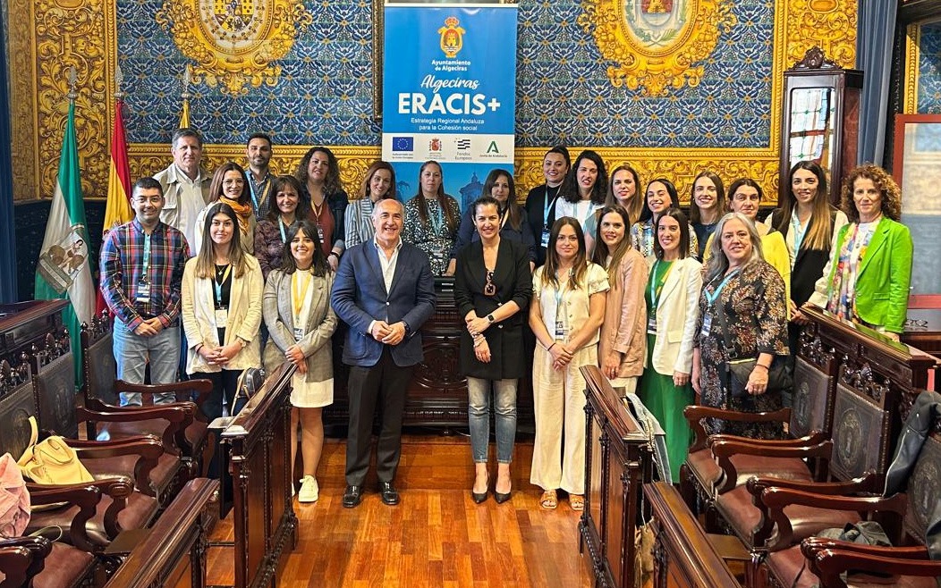 El alcalde de Algeciras, José Ignacio Landaluce, junto a la teniente de alcalde delegada de Igualdad y Bienestar Social, Paula Conesa, ha recibido en la jornada de hoy a los nuevos técnicos que participarán en el programa ERACIS+.