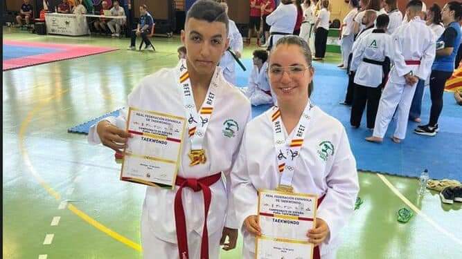 Los deportistas algecireños del Club Hércules Seul Gym, Manuel López Heredia, de 14 años, y Naiara Serrano Gómez, de 17, del Seúl Gym de Algeciras, ganaron la medalla de oro, en la categoría P-21, en el Campeonato de España de Taekwondo en la modalidad parapoomsae en Mollina, Málaga.