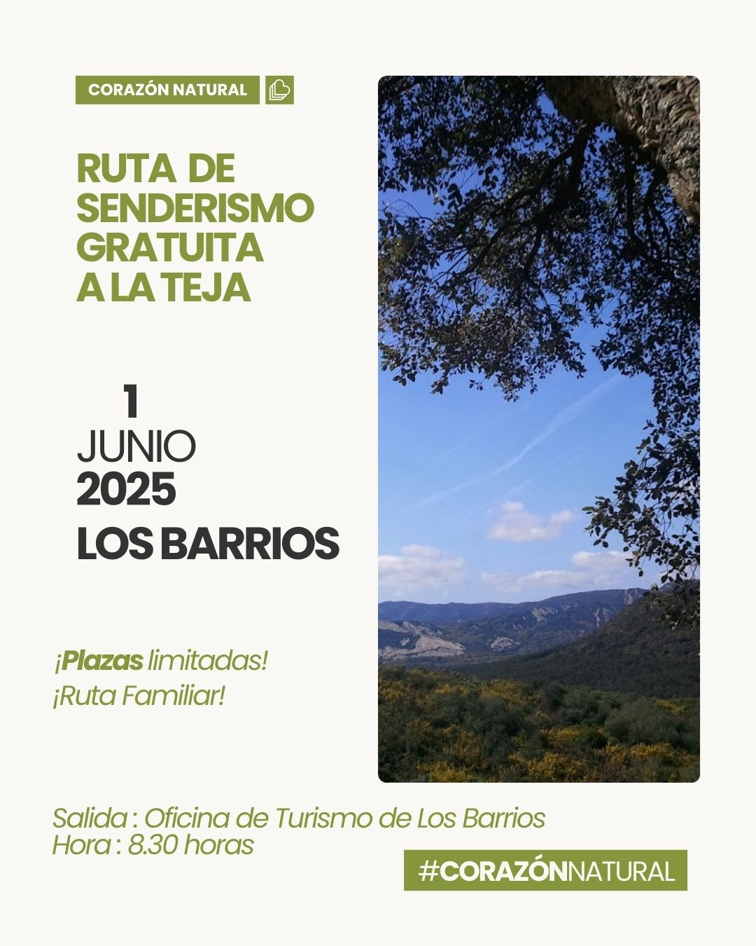 El próximo domingo 1 de junio, dentro del Programa de Primavera 2025 de la Delegación de Turismo, el Ayuntamiento de Los Barrios organiza la “Ruta de senderismo a La Teja”, una excursión gratuita de 4,5 km de dificultad media. La salida tendrá lugar a las 8:30 h desde la Oficina Municipal de Turismo.