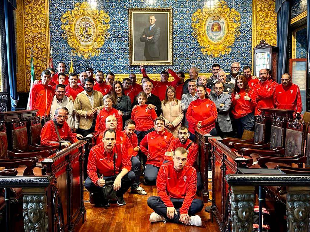 El alcalde, José Ignacio Landaluce, junto al teniente de alcalde delegado de Deportes, Jorge Juliá, a la teniente de alcalde delegada de Igualdad y Bienestar Social, Paula Conesa, y al concejal delegado de Limpieza, Vicente Palomares, han recibido en el Salón de Plenos de la Casa Consistorial a los equipos del Apadis Algeciras Genuine.
