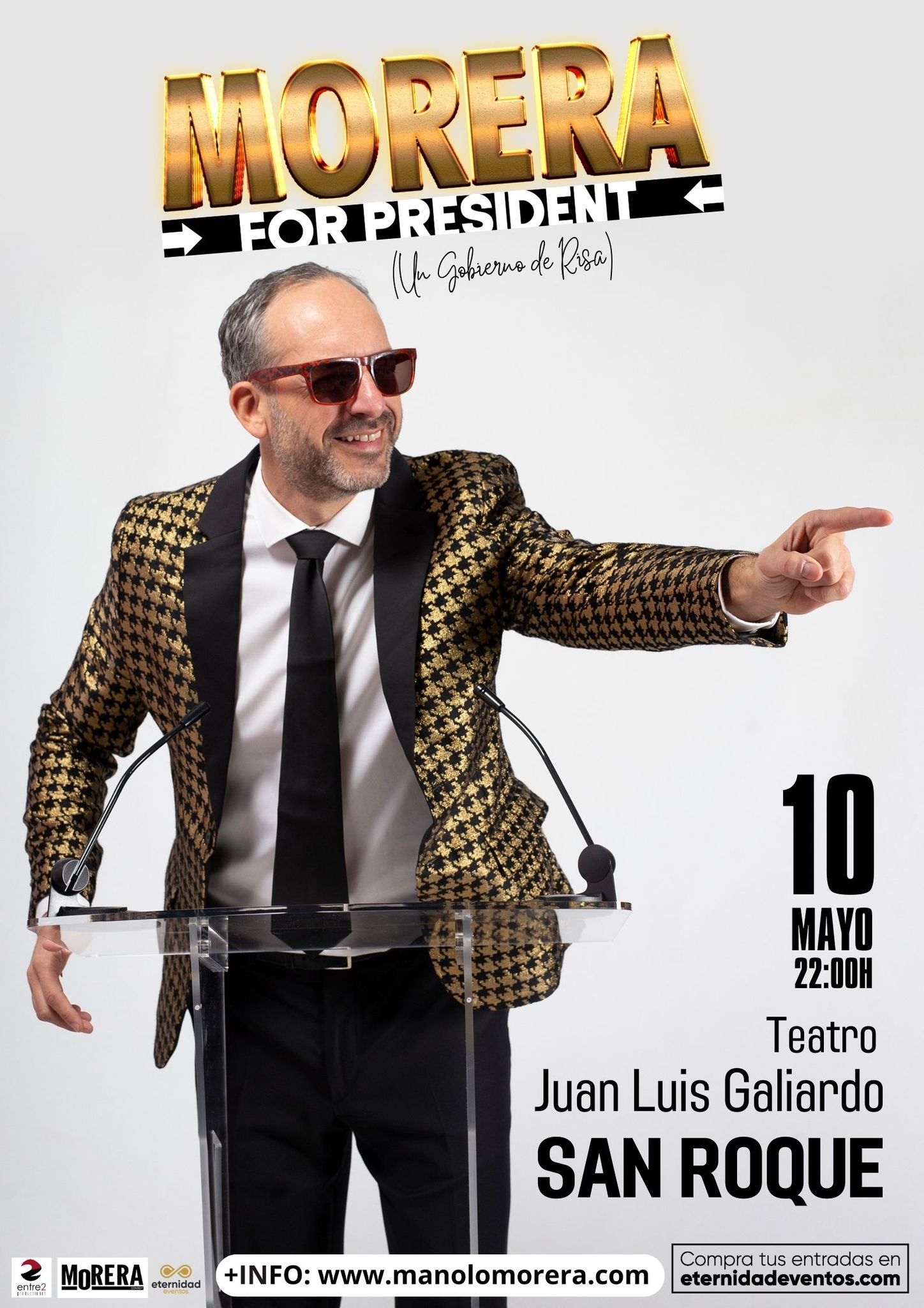 Tras el doble éxito cosechado con sus primeras obras de teatro, “Me reí, león (El Musimal)” y “La vida es un cachondeo”, y sus Monólogos, Morera presenta un nuevo espectáculo en solitario: “Morera for president”, con guion 100% Morera, escenografía y vestuario original, completando así, esta genial obra del artista.