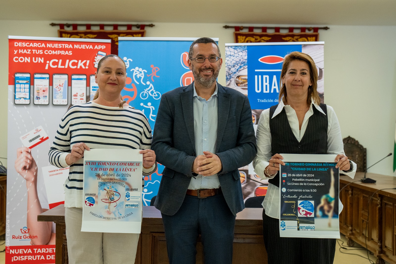 El próximo domingo, 28 de abril, se celebrará en el Pabellón Polideportivo el XVIII Torneo de Gimnasia Rítmica Ciudad de La Línea, un evento presentado hoy por el alcalde, Juan Franco; la teniente de alcalde, Zuleica Molina, y M.ª José Jerruz, presidenta del Club de Gimnasia Rítmica, que lo organiza en colaboración con la delegación municipal de Deportes.